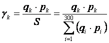 Сравнивая весовую структуру наборов базисного и расчетного периодов (при этом количества товаров в расчетном году остались такими же, как и в базисном), замечаем, что удельный вес второго товара очень значительно вырос.