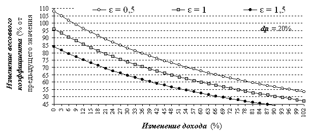 Если теперь предположить, что второй товар является товаром первой необходимости, то мы обнаружим, что для сохранения потребления второго товара на прежнем уровне необходимо сократить потребление первого товара на 4 единицы (в предположении неизменного дохода). В этом случае общая сумма расходов изменится незначительно (с 1100 грн. в базисном году до 1130 грн. в расчетном периоде). Это означает, что покупательная способность дохода потребителя снизилась на 4 единицы первого товара. Таким образом, индекс, рассчитанный на основании весовых коэффициентов базисного периода (105,4 %) в данном гипотетическом примере дает нам заниженную оценку сокращения покупательной способности дохода по сравнению с оценкой (140,91 %) по формуле (2.15).